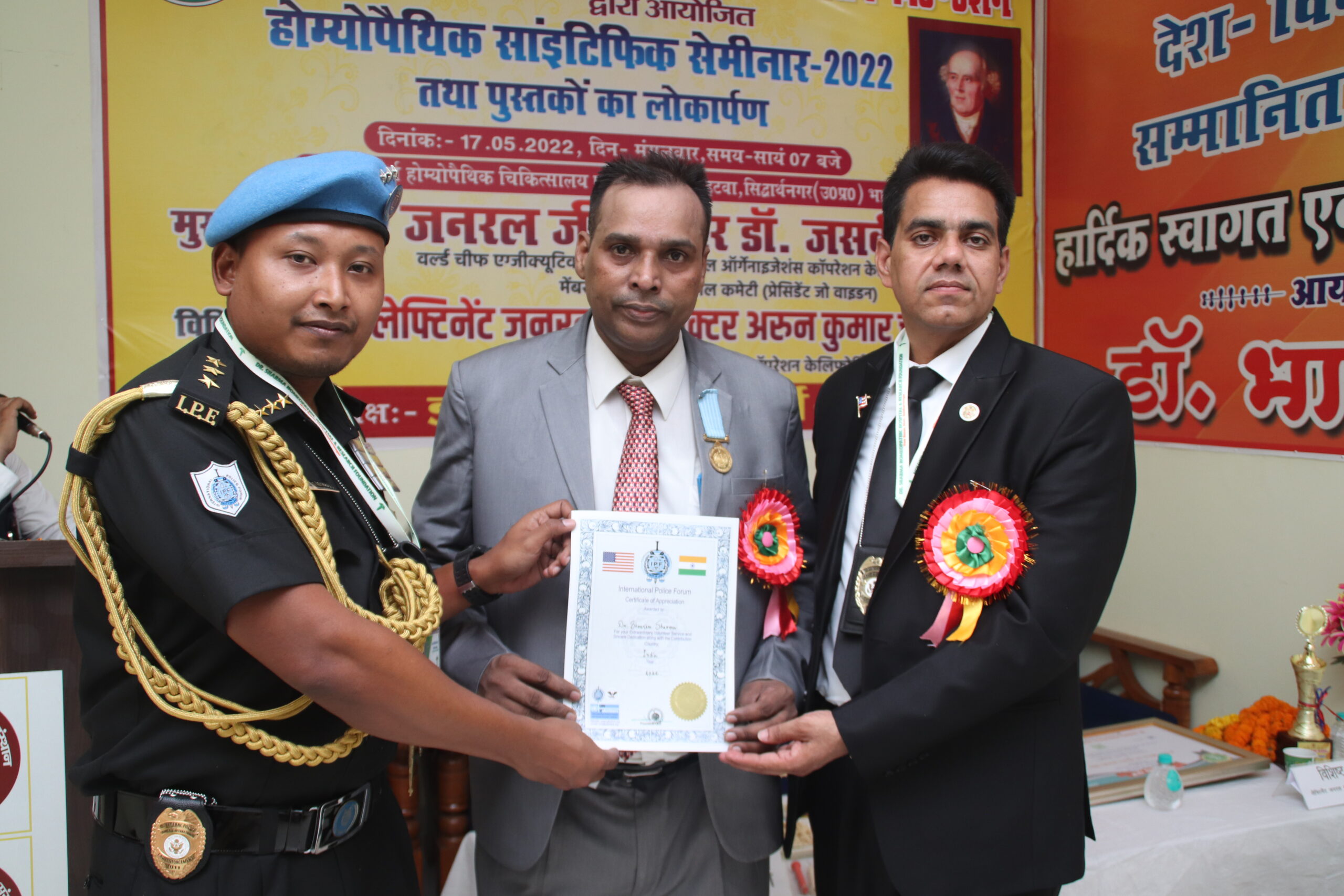 विश्व प्रसिद्ध होम्योपैथिक चिकित्सा व गिनीज वर्ल्ड रिकॉर्ड सहित सैकड़ों वर्ल्ड रिकॉर्ड धारी व सैकड़ों पुस्तकों के लेखक सिद्धार्थनगर उत्तर प्रदेश के होम्योपैथिक चिकित्सक डॉक्टर भास्कर शर्मा को 17 मई 2022 को इटवा सिद्धार्थनगर में इंटरनेशनल पुलिस फोरम अमेरिका ने डॉक्टर भास्कर शर्मा को मेडल ऑफ एक्सीलेंस अवॉर्ड 2022 मिला है। यह अवार्ड इंटरनेशनल पुलिस फोरम अमेरिका के सेक्रेटरी जनरल डॉ अरुण कुमार चालीहा ने दिया है। यह पुरस्कार सिद्धार्थनगर उत्तर प्रदेश के डॉ भास्कर शर्मा को उनके द्वारा होम्योपैथी में किए गए शोध कार्यों व उत्कृष्ट कार्यों के लिए दिया गया है। अभी हाल ही में यूनाइटेड नेशन वेलफेयर फाउंडेशन अमेरिका द्वारा 19 मार्च को भी डॉक्टर भास्कर शर्मा को प्रशंसा पत्र के साथ एक लाख का पुरस्कार भी दिया गया है। बैक पीपुल काउंसिल महाराष्ट्र में भी एक लाख का पुरस्कार दे चुके हैं। डॉ शर्मा को पूर्व राष्ट्रपति अमेरिका डोनाल्ड ट्रंप ने अपने राष्ट्रपति भवन से प्रेसीडेंशियल एक्टिव लाइफ स्टाइल अवार्ड तथा प्रेसीडेंशियल यूथ फिटनेस अवॉर्ड विथ गोल्ड मेडल से भी नवाजा जा चुका है, इतना ही नहीं डॉक्टर शर्मा को गूगल ने बेस्ट रिसर्च स्कॉलर का भी प्रमाण पत्र दिया है। डॉ शर्मा को पूर्व मुख्यमंत्री उत्तर प्रदेश अखिलेश यादव ने सर्जना पुरस्कार के साथ बीस हजार रुपए का पुरस्कार भी प्रदान किया था। इसके अलावा डॉक्टर सैमुअल हैनीमैन इंटरनेशनल अवॉर्ड लंदन,वरिष्ठ होम्योपैथिक इंटरनेशनल अवॉर्ड सिंगापुर,डॉ एलेन इंटरनेशनल अवॉर्ड थाईलैंड,डॉ कैंट इंटरनेशनल अवॉर्ड मलेशिया,ग्लोबल आइकॉन पर्सनैलिटी ऑफ होम्योपैथी दुबई,होम्योपैथी शिरोमणि इंटरनेशनल अवॉर्ड मस्कट,स्टार आफ होम्योपैथी अवॉर्ड लंदन,ग्लोबल एनवायरमेंटल अवार्ड फिलीपींस,साहित्य रत्न अवॉर्ड कनाडा,बेस्ट होम्योपैथी अवार्ड नाइजीरिया, ग्लोबल आईकॉन पर्सनालिटी अवार्ड अफ्रीका,इंटरनेशनल पीस अवॉर्ड इंडोनेशिया,डॉक्टरेट अवॉर्ड अल्जीरिया,होम्यो भूषण काठमांडू,होम्योपैथी श्री गोवा,होम्योपैथी रत्न,चिकित्सा रत्न सम्मान प्राप्त कर चुके हैं। डॉ० भास्कर शर्मा ने दुनिया में सबसे बड़ी गुर्दे की पथरी को तथा दुनिया में सबसे अधिक गुर्दे की पथरी बिना ऑपरेशन होम्योपैथी औषधि द्वारा गलाने पर,दुनिया की सबसे बड़ी बच्चेदानी की गांठ बिना ऑपरेशन होम्योपैथी औषधि द्वारा गलाने पर,दुनिया में सबसे अधिक मरीज देखने,दुनिया में सबसे अधिक निशुल्क चिकित्सा शिविर लगाने,होम्योपैथी के जन्मदाता डॉक्टर हनीमैन जयंती पर ग्रामीण अंचल में लंबी मानव श्रृंखला बनाने हेतु,होम्योपैथिक औषधि द्वारा अधिकतम रोगियों को गर्भाशय में गांठ को ठीक करने हेतु,वर्ष 2017 में बाल झड़ने वाले 