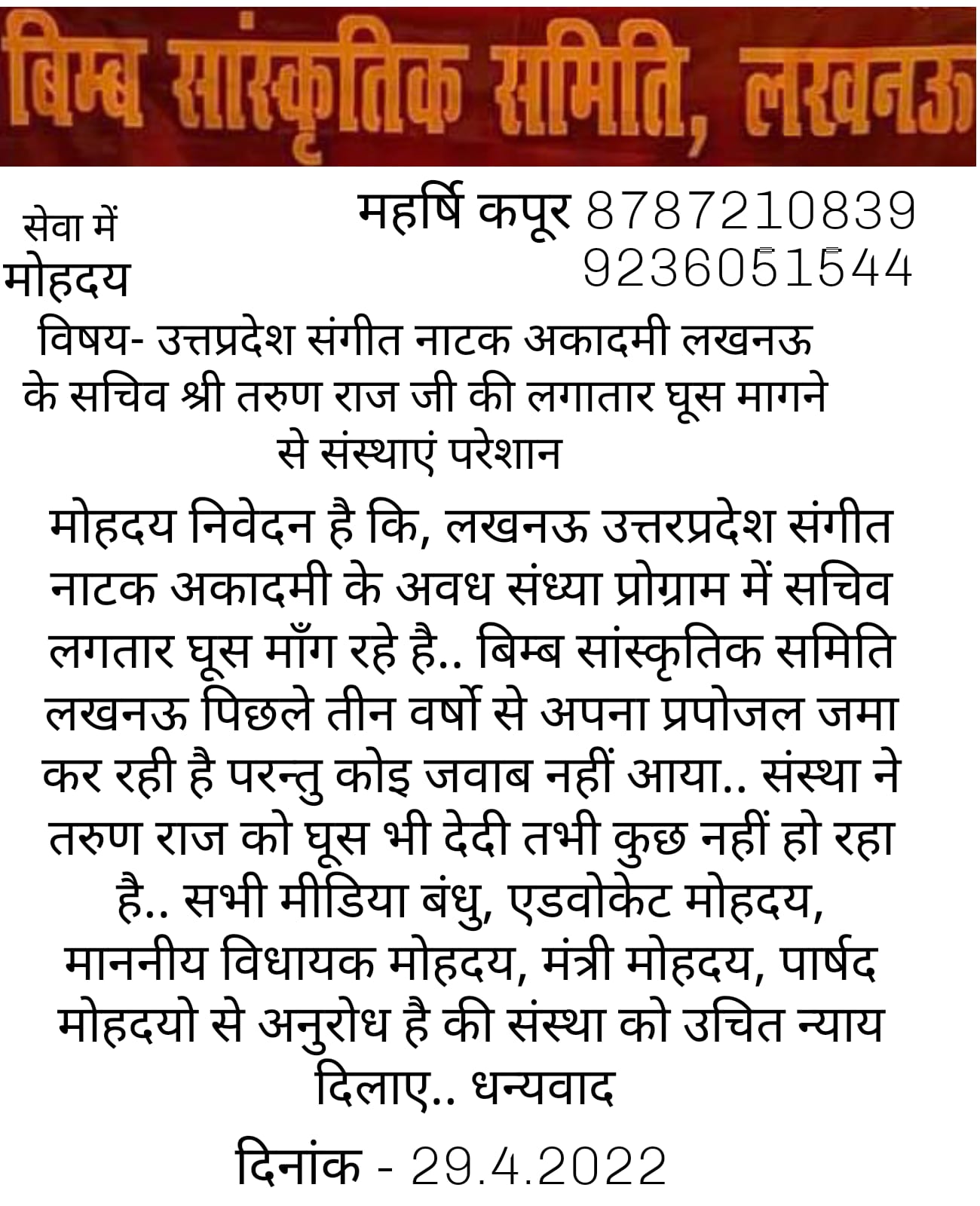 संगीत नाटक अकादमी के अधिकारी तरुण राज अवध संध्या मे प्रोग्राम लागने के लिए बिम्ब सांस्कृतिक समिति लखनऊ से की अंग्रेजी दारू की माँग..